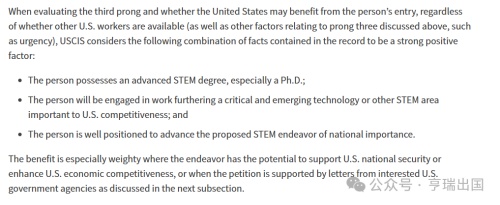 且NIW的审核标准认为拥有理工博士学位是一个强有力的积极因素,这是Y先生比之同行特别明显的一个优势,具体请见下方美国移民局《政策手册》(Policy Manual)关于职业移民类别高等学位或杰出才能的说明: