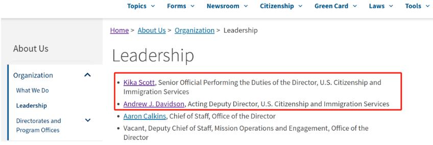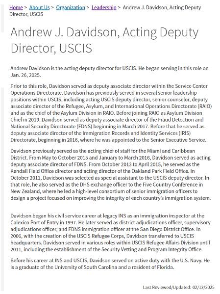 据美国移民局2025年2月13日更新的信息显示,从2025年1月26日起,Andrew J. Davidson开始担任移民局副局长及代理局长职务。