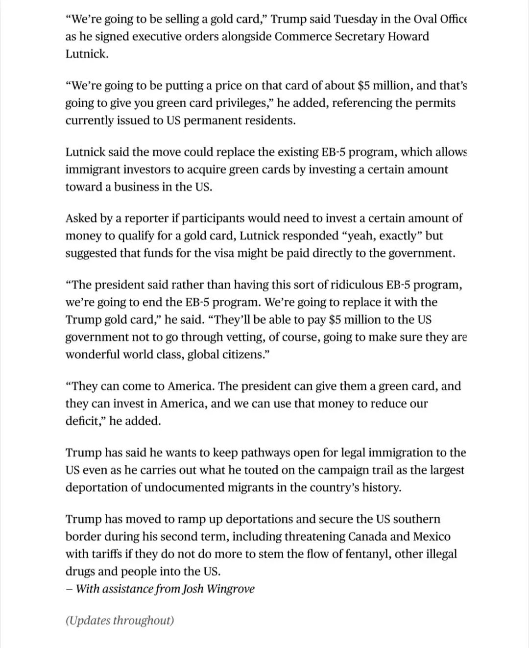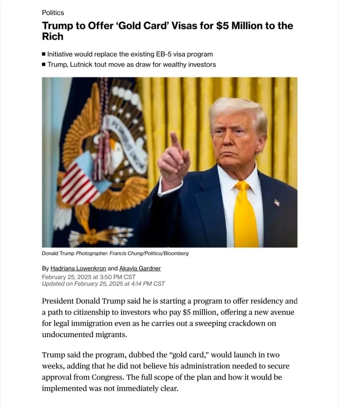 “总统说,与其继续这种荒谬的 EB-5 计划,我们不如终止 EB-5 计划。我们将用金卡取而代之,这样他们就可以向美国政府支付 500 万美元,而不必经过复杂的程序。”