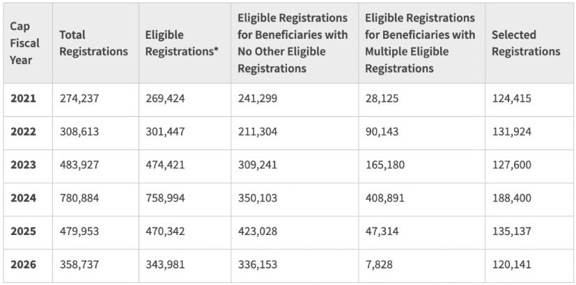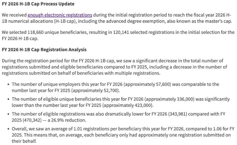 美国移民局公布了2026财年H-1B的注册和抽签数据:
