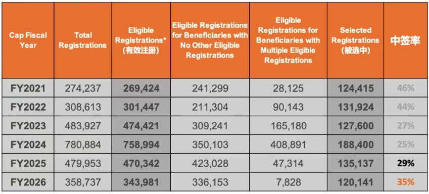 小亨发现在看到中签率大幅提升的这个好消息同时,我们也发现,从数据上看,中签率提升的原因不是被抽中的总人数变多了,而是总申请人变少了。2026财年有效申请只有34万,去年是47万。