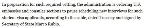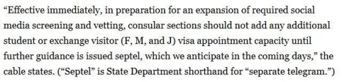 电报中写道:“即刻生效:为准备扩大社交媒体筛查与审查要求,在进一步通知发布前,各领区不得新增任何学生或交流访问学者(F、M、J类签证)的面谈名额。”