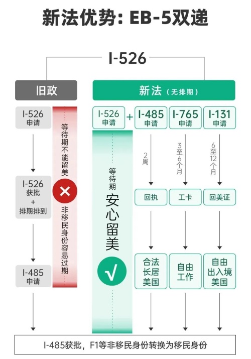 EB-5预留签证项目,无排期、审批快,还有最显著的优势——允许“双递交”:在美申请人可同时递交I-526E和I-485申请,以及同时申请Combo卡(EAD工卡+AP回美纸)!合法长居美国轻松实现!尤其适合境内留学生群体!