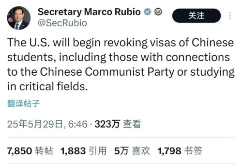 当地时间5月28日,美国国务卿鲁比奥在社交媒体X平台发文宣称,美国将开始吊销中国学生的签证,包括“与中国政府有联系或在关键领域学习”的学生。