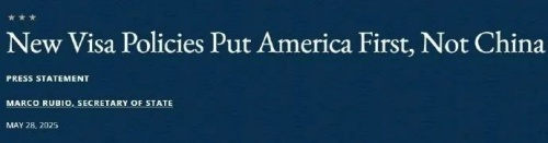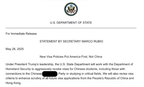 鲁比奥在声明中放话说:“在特朗普总统的领导下,美国国务院将与国土安全部合作,狠狠吊销(aggressively revoke)中国学生的签证……我们还将修改签证标准,以加强对来自中国内地和香港的所有未来签证申请的审查。”