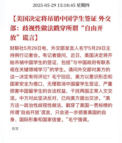 而针对特朗普政府的这个做法,北京时间5月29日,外交部发言人毛宁表示,美方以意识形态和国家安全为借口,无理取消中国留学生签证,严重损害中国留学生的合法权益,干扰两国正常人文交流。中方对此坚决反对,已向美方提出交涉。