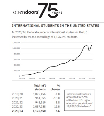 国际教育协会IIE《门户开放报告》指出,2023-24学年美国高校国际生(包括毕业后为积累工作经验,短期留在美国的学生)总数突破112万,创历史峰值。