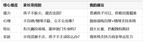 不同阶段出国,优势与挑战完全不同。家长必须从三个维度同时权衡:孩子心理成熟度、学术准备度、家庭支持力。