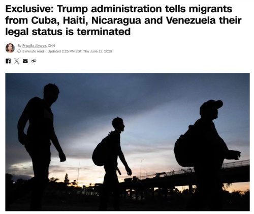 当地时间6月12日,美国国土安全部(DHS)突然发布声明,正式取消古巴、海地、尼加拉瓜与委内瑞拉四国公民通过“人道主义假释”计划获得的临时合法居留与工作许可,并命令他们尽快主动离境。
