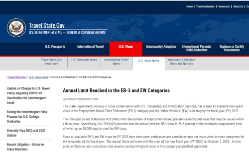 继EB-2和EB-1之后,当地时间9月9日,国务院签证办公室再发通知:2025财年职业移民类别EB-3和EW类别的所有移民签证名额已全部用完。