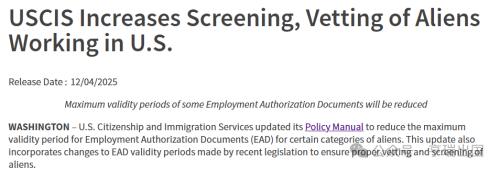 根据USCIS发布的最新官方消息,自 2025年12月5日(即日起)提交或正在等待审批的申请,其部分类别的工卡(EAD)最长有效期将从目前的 5年大幅缩短至18个月。