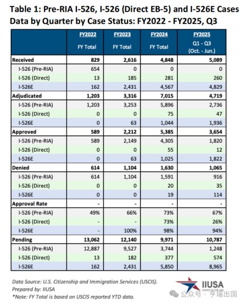 从审批数据来看,2025财年第三季度累计批准了1047 份I-526E。这是自《改革与诚信法案》(RIA)颁布以来的最大季度批准总量。