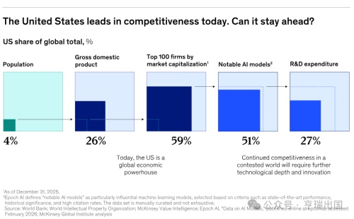 在更具竞争力的指标中,其份额更高:拥有全球前100强企业市值总量的59%,贡献了全球27%的研发支出,并拥有全球51%的知名AI模型。
