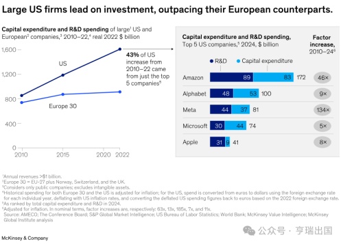 从2010年到2022年,美国大型企业资本支出和研发投入的增长中,有43%来自于排名前五的企业(亚马逊、Alphabet、Meta、微软、苹果)。其中,Meta的投入在2010-2024年间增长了134倍,亚马逊增长了46倍。