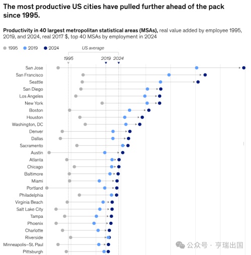 拥有深厚知识生态系统的城市则取得了非凡的成就,并持续提供高收入机会。自1995年以来,美国生产力最高的城市(如圣何塞、旧金山、西雅图)与全国平均水平的差距不断拉大。