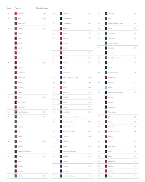 根据排名,新加坡位居榜首,其护照可免签前往193个国家和地区。日本和韩国以可免签前往190个国家和地区,二者并列第二。