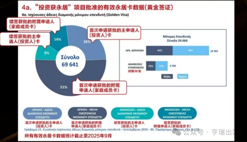 截至2025年9月,希腊黄金签证项目批准的有效永居卡中,首次申请获批的主申请人(投资人):26%;首次申请获批的附属申请人(家庭成员卡):51%;续签获批的主申请人(投资人):9%;续签获批的附属申请人(家庭成员卡):14%。