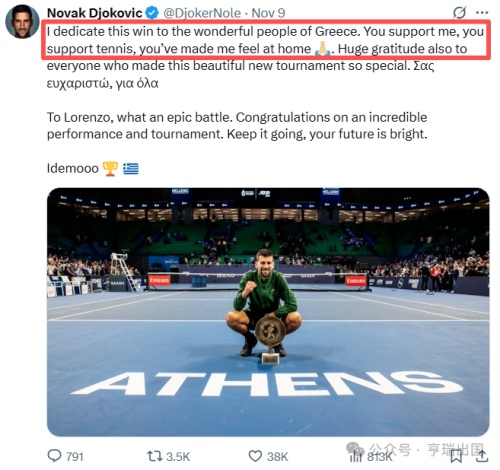 在比赛夺冠时刻,德约科维奇在社交平台上公开表达了对希腊的喜爱:“我将这场胜利献给希腊的美好人民。你们支持我,支持网球,让我感到宾至如归。”。