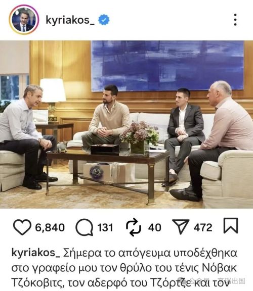 随后的一周,在11月17日,德约科维奇与希腊总理米佐塔基斯进行了会谈,据英国Daily Express 11月18日报道: